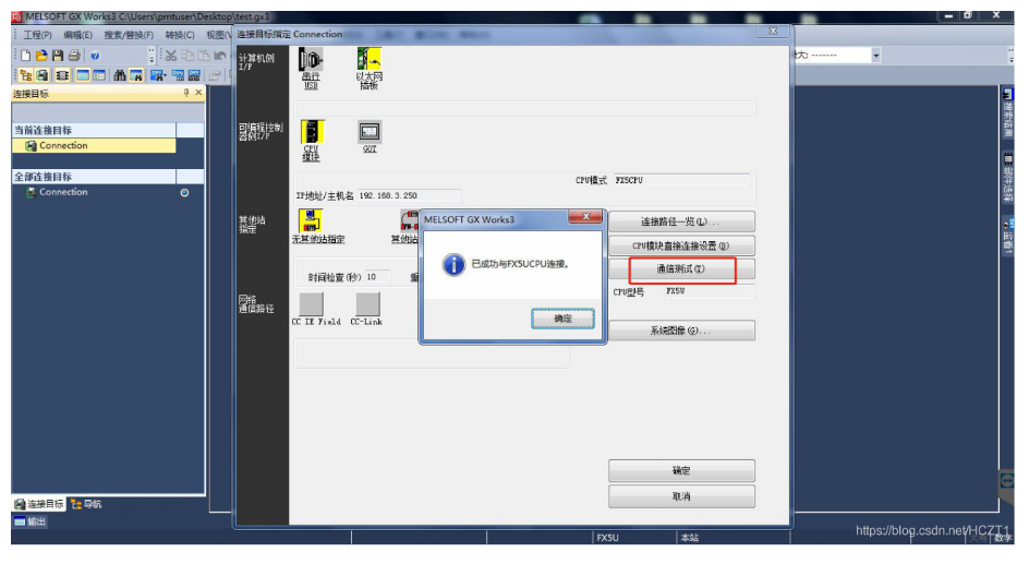 点击【通信测试】,提示“已成功与FX5UCPU连接”。